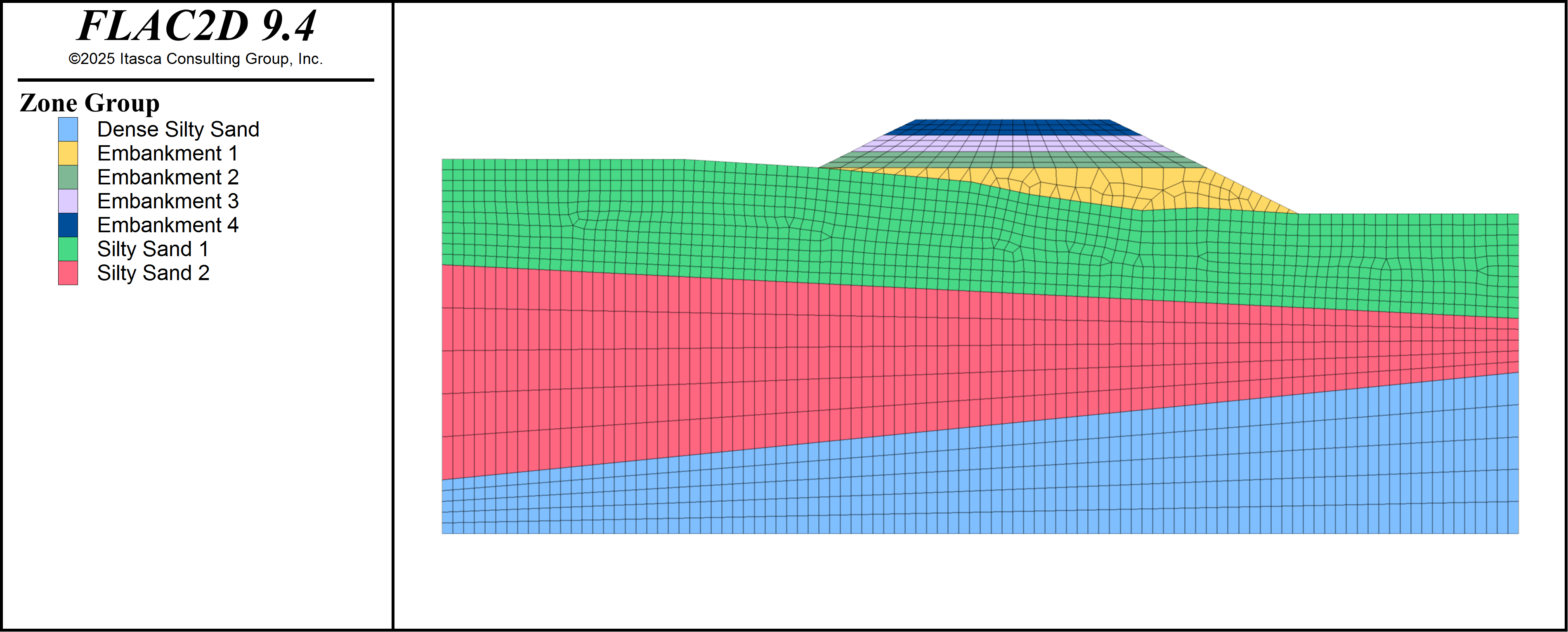 This example illustrates the use of FLAC2D to analyze soil consolidation underneath an embankment by utilizing a loosely-coupled fluid-mechanical approach. This problem is common in geotechnical engineering and arises when road embankments are to be constructed over saturated soils in a short amount of time. Due to excess pore pressure generation of low permeability soils, the embankment is usually constructed in multiple lifts. The embankment is constructed in four lifts over 60 days, during which pore pressure dissipation and soil consolidation takes place. A load representing traffic is placed on the top of the embankment following the last lift. The full construction sequence is given in Table 1. The numerical model initially contains the four embankment layers but are nulled prior to gravity initialization. The null zones are considered not present for most purposes during calculations or plotting. Each embankment layer is set non-null at the time of construction, providing an additional load due to the weight associated with the layer.