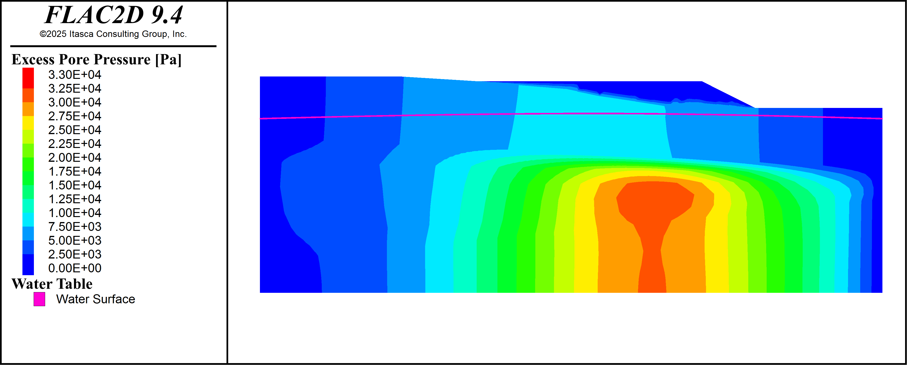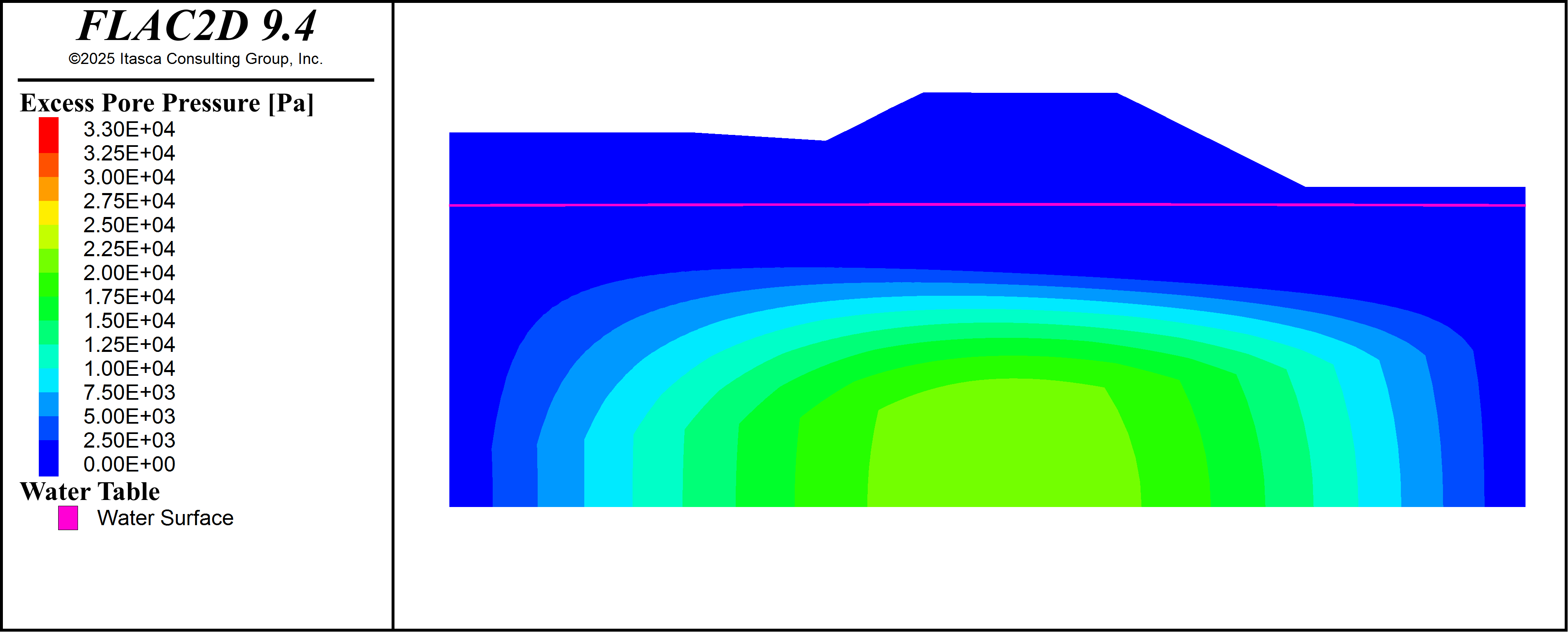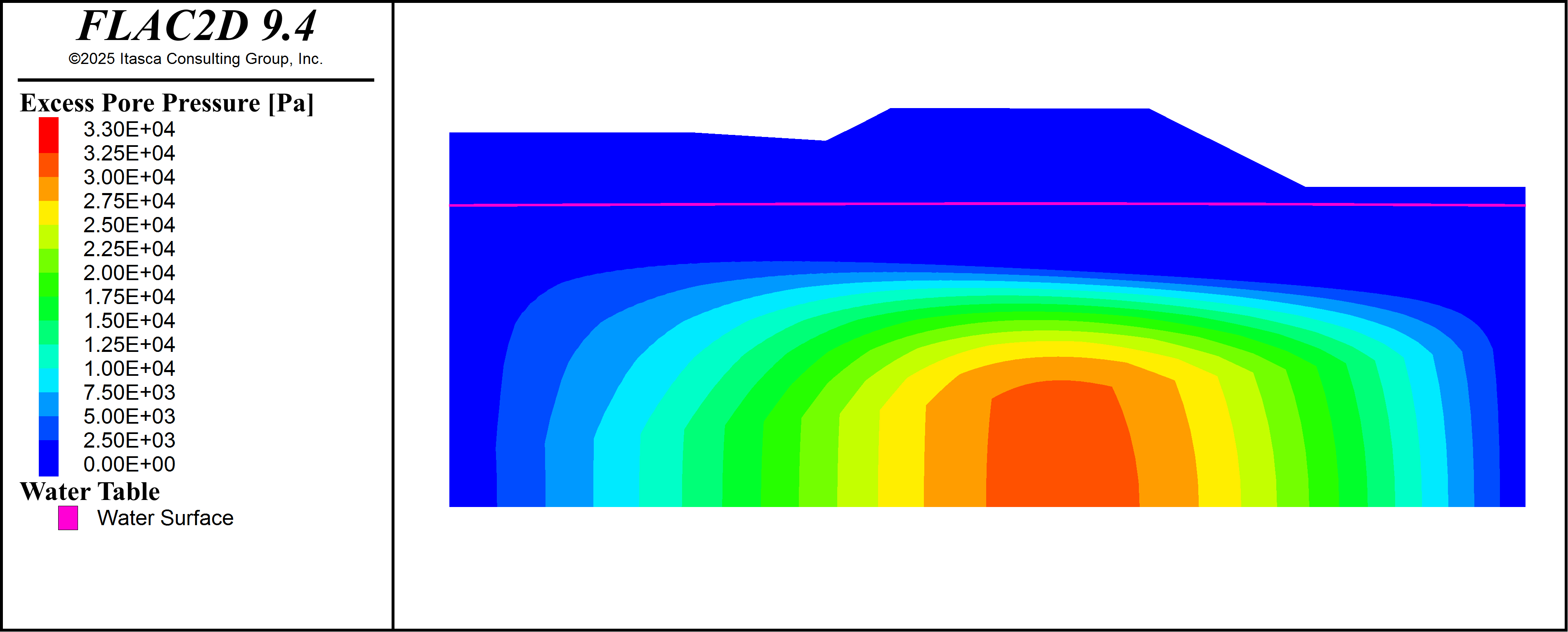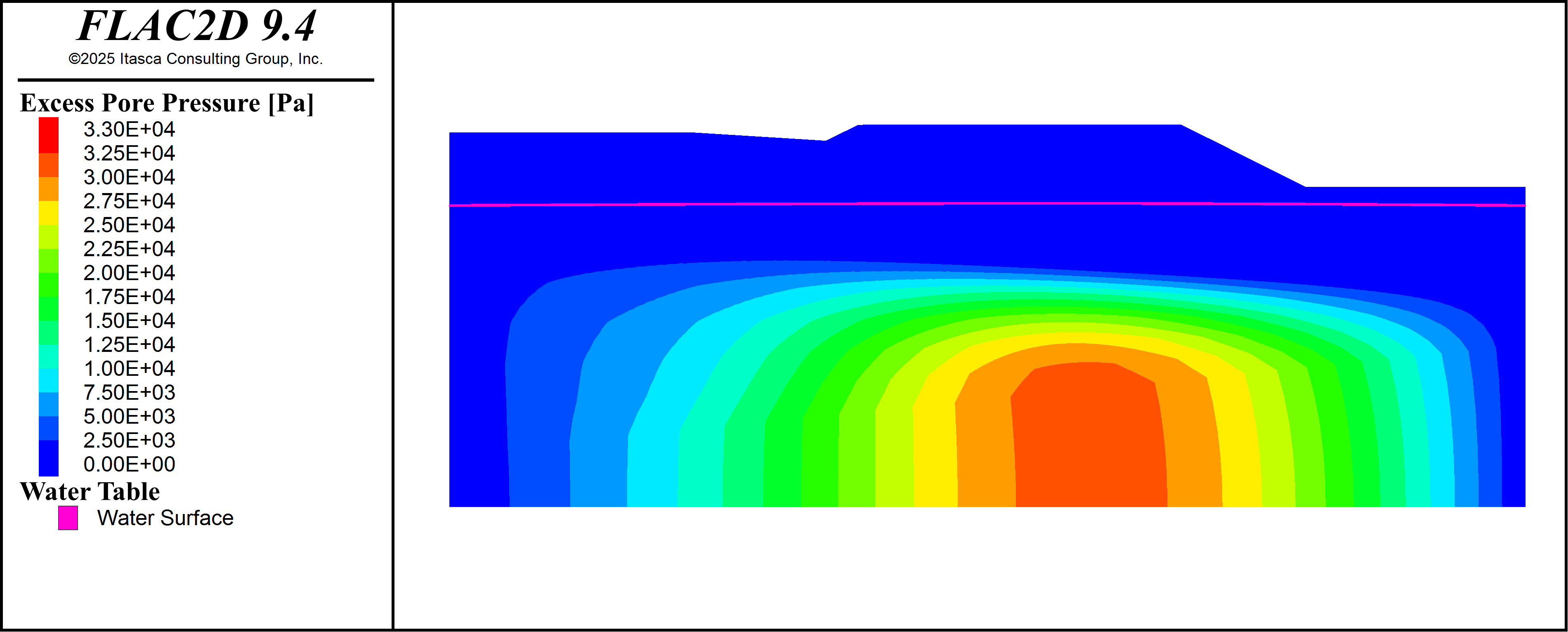 Figure 4: Excess pore pressure distribution after construction of the third lift (\(t=20\) days).