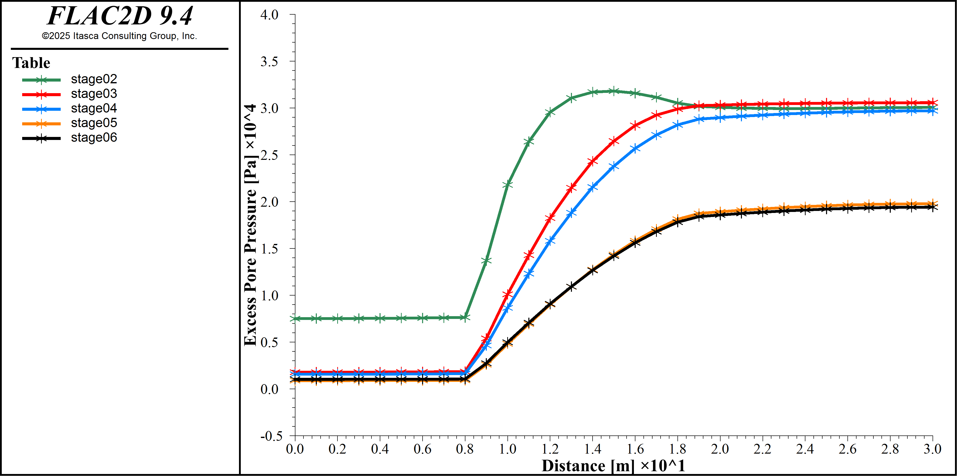 The excess pore pressure along a vertical line under the embankment is stored in a table for plotting using a FISH function. Figure 7 shows the excess pore pressure during the construction sequence. The \(x\)-axis represents the distance along the cut-line with the base of the embankment at a distance of 0 m and the base of the model at a distance of 30 m.