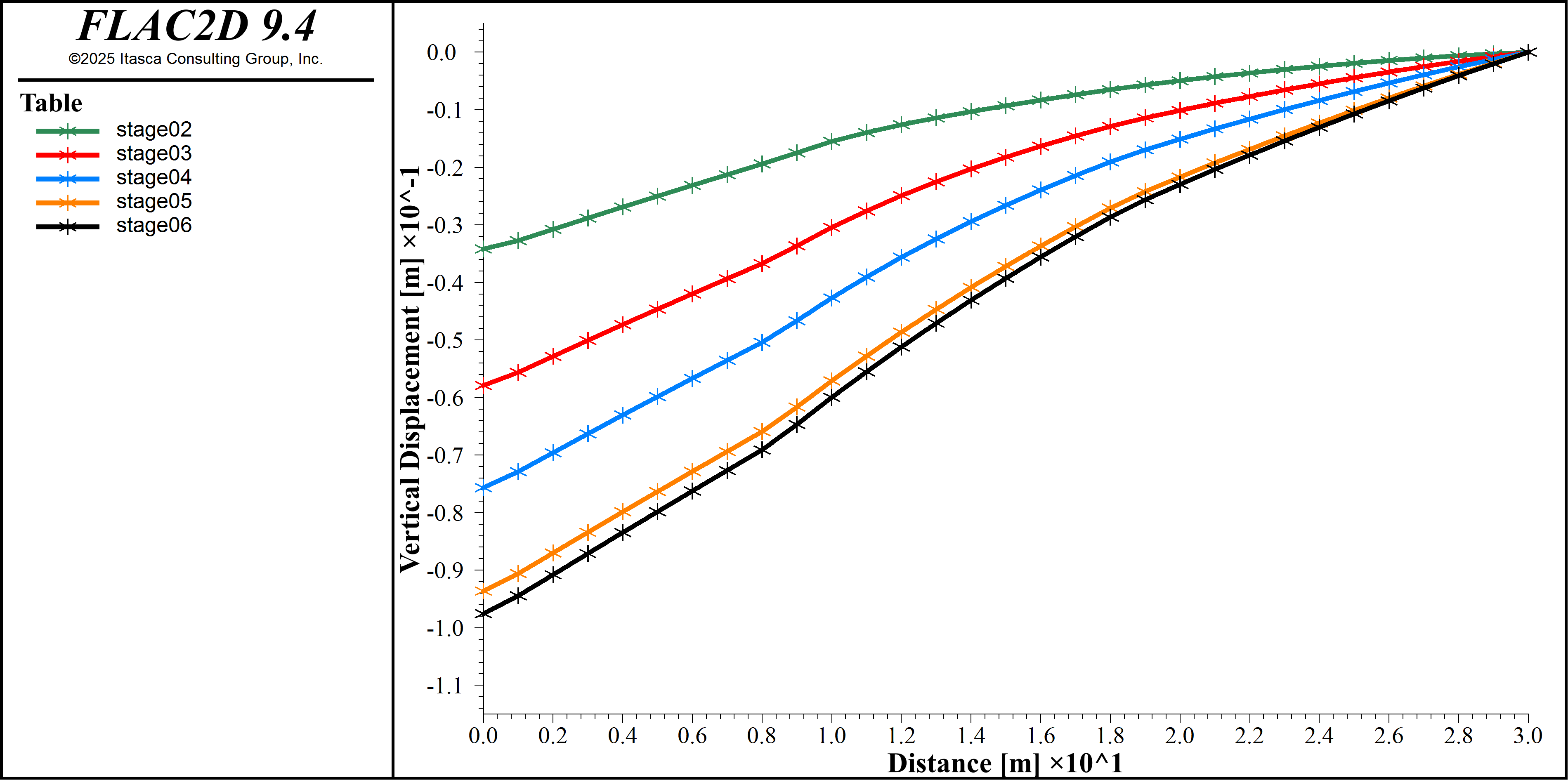 The vertical displacement along a vertical line under the embankment is stored in a table for plotting using a FISH function. Figure 8 shows the settlement during the construction sequence. The \(x\)-axis represents the distance along the cut-line with the base of the embankment at a distance of 0 m and the base of the model at a distance of 30 m. As with the excess pore pressure plots, the settlement profile for each stage could be generated with the Profile plot item, but in this example, the profiles were stored in tables using FISH so all stages could be plotted together.