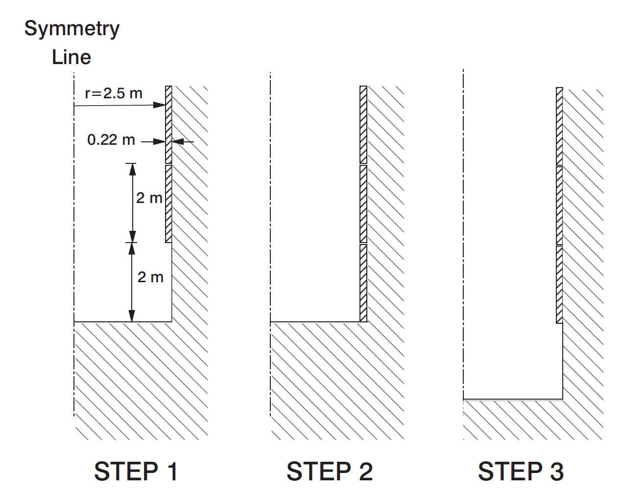 Figure 1: Problem geometry and excavation steps.