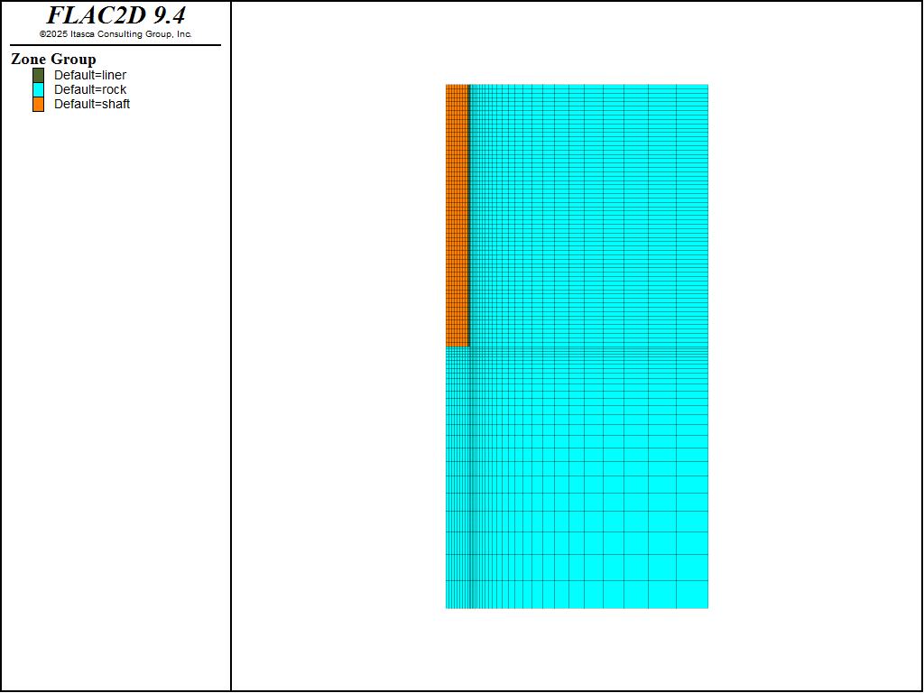 For the unlined case, the excavation of the 30 meters has been modeled in only one step (see “UNLINED.DAT”). For the lined case, the excavation sequence is followed. The FISH function excav in “LINED.DAT” simulates the excavation sequence. Figure 2 show the zone geometry before excvavation.