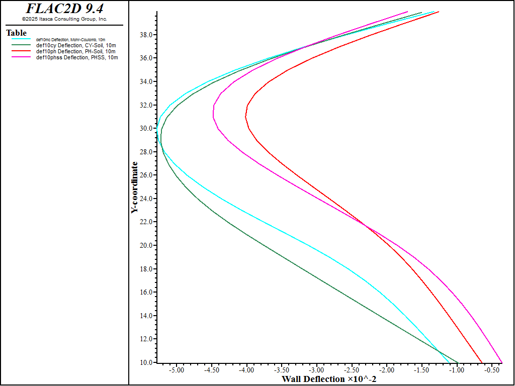 The deformation of the soils during excavation is of particular interest in this example—specifically the heave at the bottom of the excavation and the surface settlement adjacent to the excavation wall. Three different material models—the Mohr-Coulomb model, the CYSoil model and the Plastic Hardening model (without and with small-strain stiffness option)—are used to illustrate the effect of the material model on the calculated deformational response of the soil. It is noted that for uniform elastic properties, the linear elastic/perfectly plastic Mohr-Coulomb model may predict unrealistically large deformations in soils subjected to loading and unloading, such as heave induced at the bottom of excavations. A more realistic calculation may be obtained with the nonlinear elastic/plastic CYSoil model.