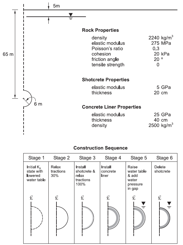 A circular tunnel with an excavated radius of 6 m, and with its center at a depth of 65 m below the surface, is constructed in saturated ground. The pre-construction water table is at a depth of 5 m below the surface. The ground is dewatered during the construction phase. The tunnel is supported by a temporary shotcrete liner, which is installed while the tunnel excavation advances, and a final cast-in-place 0.4 m-thick concrete liner. The analysis is required to determine the forces and moments that develop in the concrete liner both when the water level returns to its original elevation and when, at a later time, the temporary shotcrete liner loses its strength.