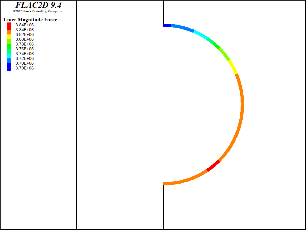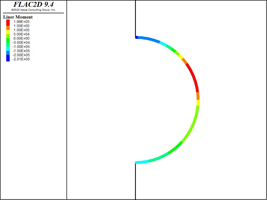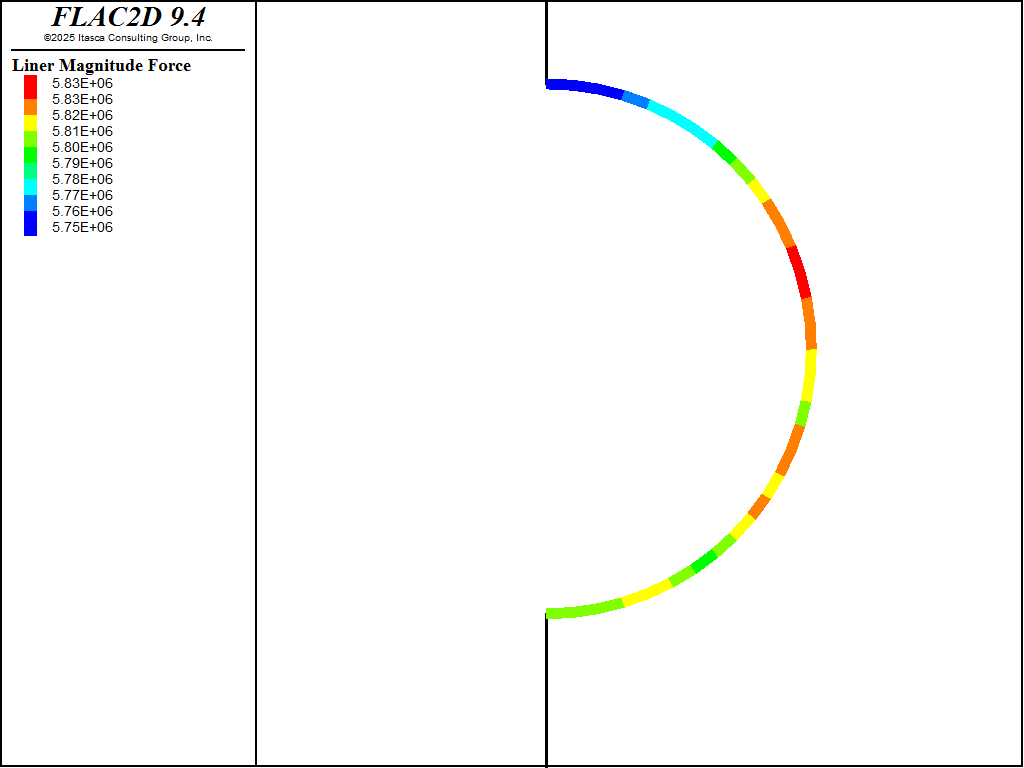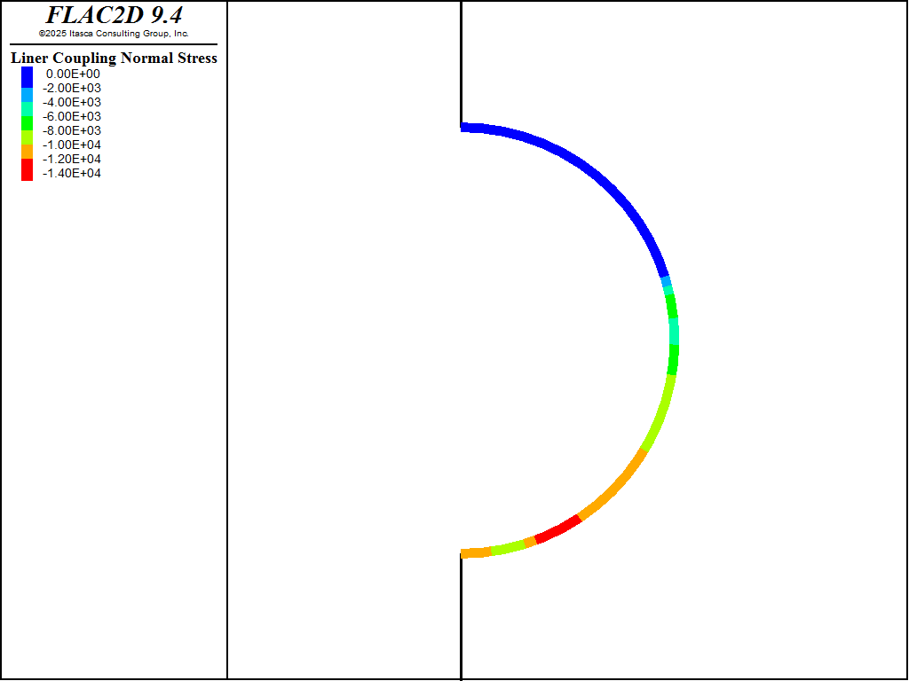 The cast-in-place concrete liner is installed in Step 4. The FISH function named “MoveLiner” is used to move the liner nodes away from the tunnel boundary to create an initial gap of 1 cm between the liner elements and the grid. The translation and rotation fixity conditions for the concrete-liner nodes along the center line must also be set. This satisfies the symmetry condition as done previously for the shotcrete liner. The model is stepped again to an equilibrium state. The concrete liner settles onto the grid at the invert of the tunnel, and normal stresses develop along the boundary between the soil and the liner, as shown in Figure 9. The coupling spring normal stress plot is used to clearly show those segments in contact.