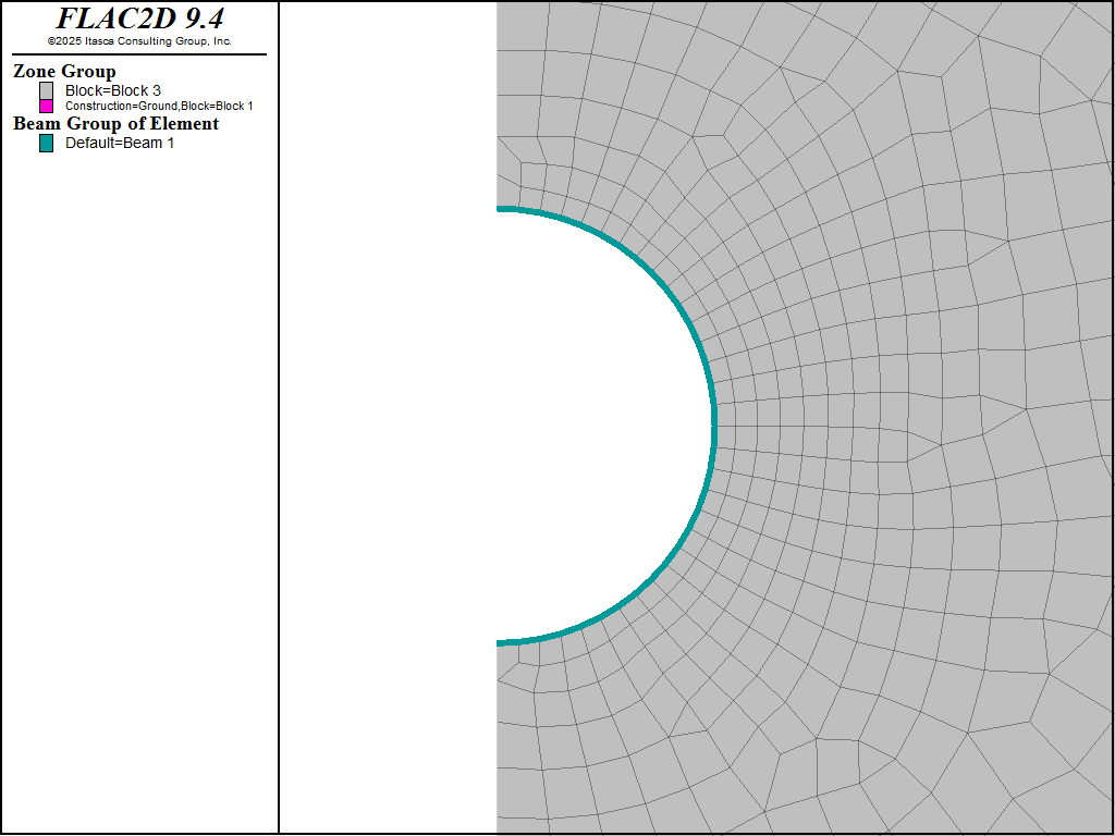 The tunnel is now relaxed completely. Before this, beam elements are added representing the shotcrete. The structural nodes are attached directly to the grid, as shown in Figure 6. The model is then brought to equilibrium. Note that the weight of the shotcrete is neglected for this example. Because only one-half of the beam is modeled, the nodes along the line of symmetry must be fixed from translation in the \(x\)-direction and from rotation.
