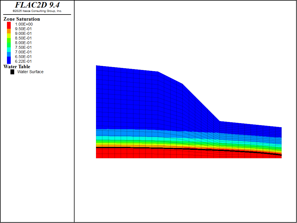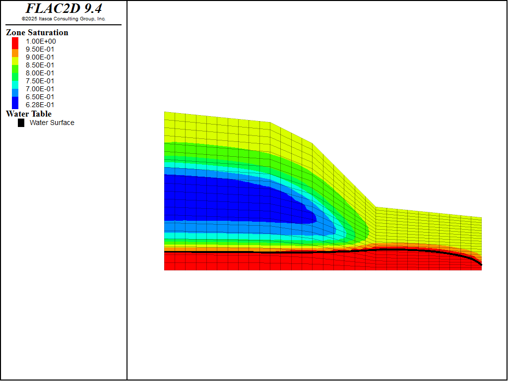 It is assumed that rain falls at a constant rate of 84 mm/month (3.22e-8 m/s). Because rain falls vertically, and discharge is applied perpendicular to the faces, a simple FISH function is used to scale the applied discharge on the non-horizontal top surfaces. It is also assumed that the water table is at 1 m on the right side of the model (toe of the slope). The model is solved to steady state and the pore pressures are shown in Figure 1 above. Saturation contours are shown in Figure 6. It can be seen that the majority of the slope is not fully saturated and has negative pore pressure (suction). This means that the slope is mechanically stable, even though the steepest slope angle (45º) is higher than the friction angle (30º). The displacements are shown in Figure 7.