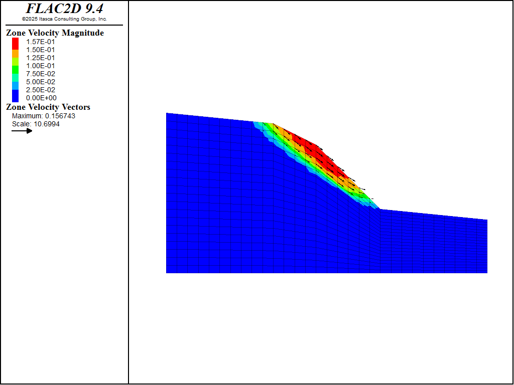 The second rainfall event corresponds to an additional 228 mm (nine inches) of rainfall over a period of four days. A coupled numerical simulation is conducted to cover the time scale of this event. The slope is failing in this case. The velocity at the end of the simulation are shown in Figure 8. Contours of saturation are shown in Figure 9.