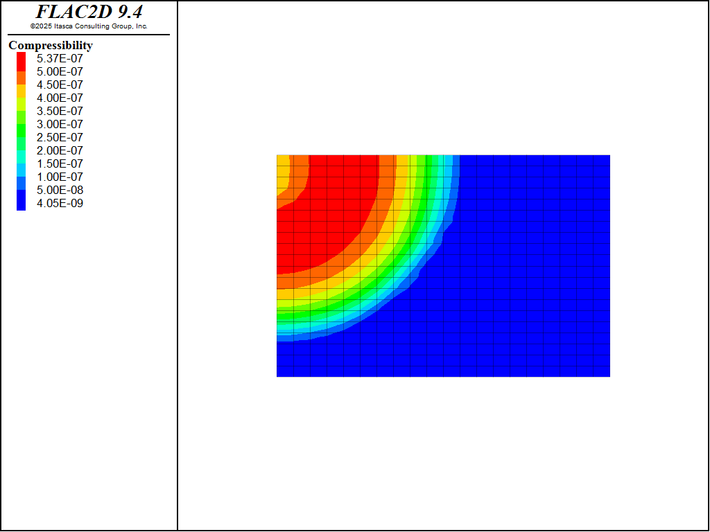 Figure 3: Fluid compressibility contours at the end of the infiltration period. Fully saturated compressibility is \(4 \times 10^{-7}\) Pa-1.