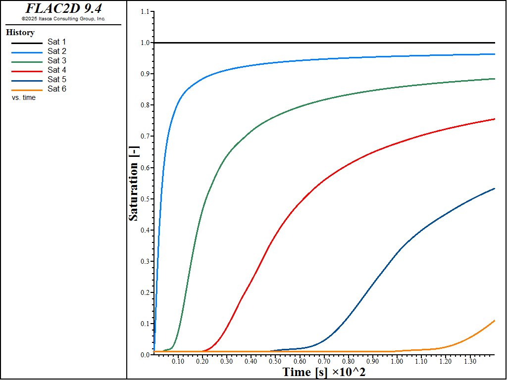 Figure 1 shows the evolution of saturation at monitoring points indicated in Figure 2 for the first 140 seconds after the caisson is placed in contact with water. It is clear that 140 seconds is enough time for the saturation front to reach all monitoring points. Contours of saturation at the end of the infiltration period are shown in Figure 2. Lastly, the partially-saturated fluid compressibility (inverse of Biot modulus) is shown in Figure 3.