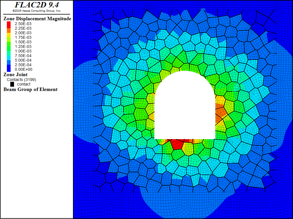 Excavation is performed with the zone relax excavate command. The resulting displacements are shown in Figure 8. The largest deformations are occuring at the sides and the bottom of the tunnel. Joint shear displacements are shown in Figure 9.