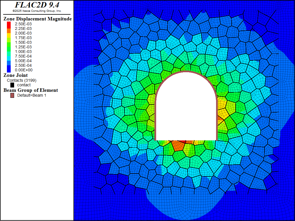 After specifying joint and rock properties, initial conditions and boundary conditions, the model is solved. Displacements are small, as expected (< 1 mm).