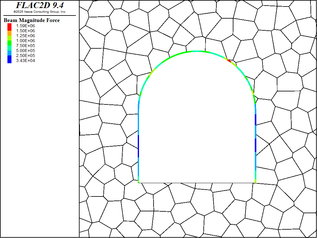 In this example, a liner is not necessary because the rock is stable without one, but it is possible that for a different random configuration of voronois, there could conceivably be wedges forming and blocks falling. For this reason, the liner is only added to the sides and the top of the tunnel.