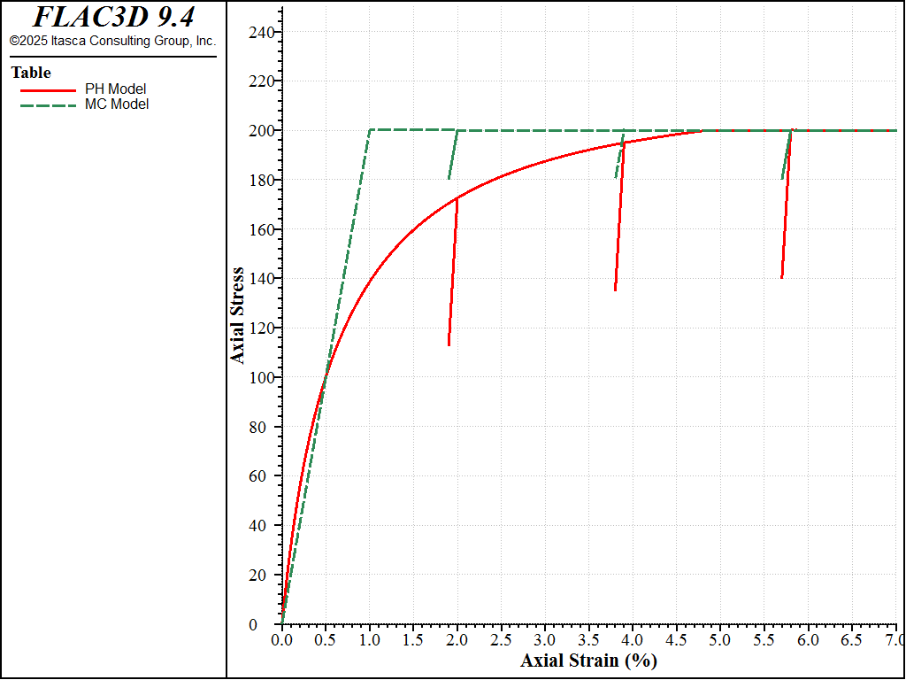 Figure 1 shows a plot deviatoric stress versus axial strain for both PH and MC models. It is easy to verify the following from the figure: