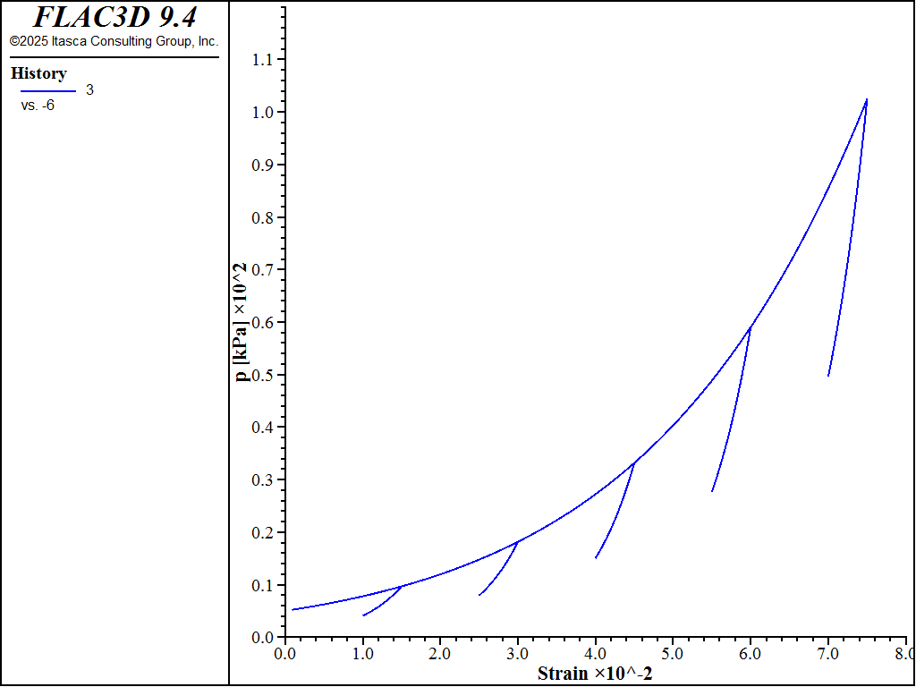 This simple one-zone example exercises the modified Cam-Clay model for a normally consolidated material subjected to several load-unload excursions in an isotropic compression test. Following sentence doesn’t make sense. The initial stresses is at isotropic stress so that \(\sigma_{xx}\) = \(\sigma_{yy}\) = \(\sigma_{zz}\) = -5 kPa. The material properties include the following: