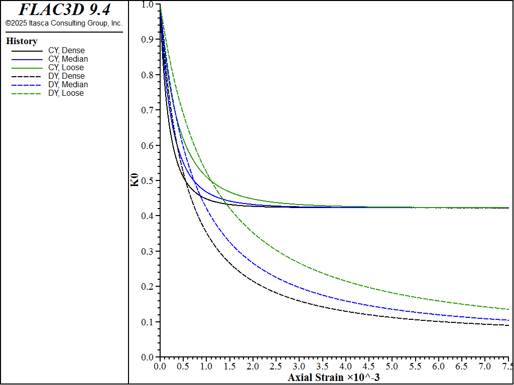 The results of the oedometer simulations show that, with the given properties, a higher value of \(K_0\) is achieved for the CYSoil model than the double-yield model. And for all tests, the lower the aspect ratio of the cap, the higher the \(K_0\) that is achieved. Also, dense, medium, and loose sands converge to the same ultimate \(K_0\) value as deformation takes place, and they do so at a faster deformation rate for the CYSoil model than the double-yield model.