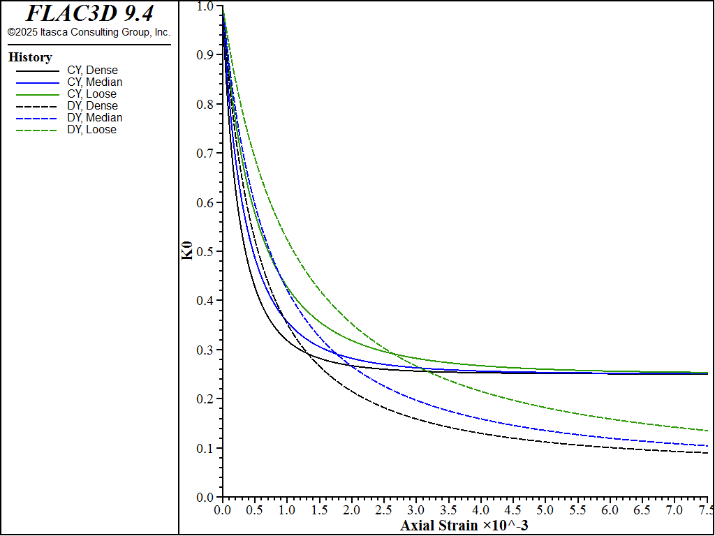 Figure 1: \(K_0\) versus axial strain for dense, medium, and loose sand—\(\alpha\) = 0.5 (solid lines) and double-yield model (dashed lines).
