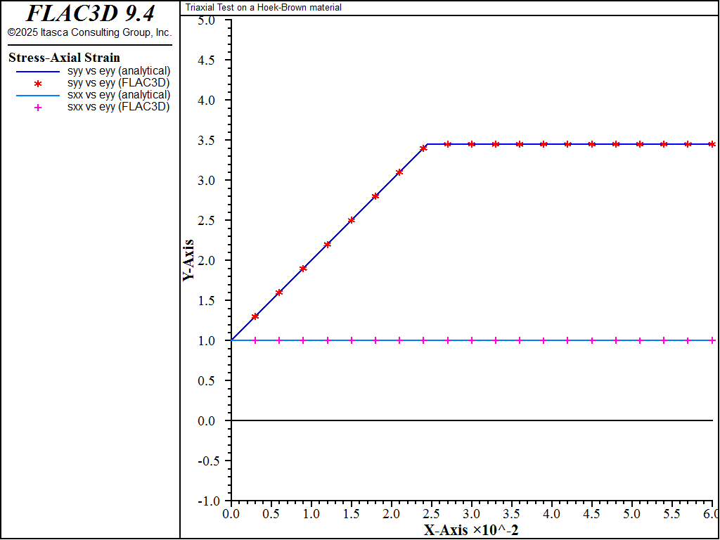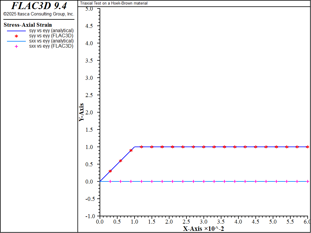The FLAC3D results for the zero confining stress case are compared to the analytical solution (see Triaxial Compression Test with Hoek-Brown-PAC Model) in Figure 1 and Figure 2, and the results for the high confining stress case are compared in Figure 3 and Figure 4.