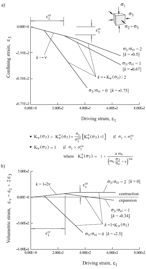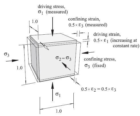 A single-zone model to simulate the triaxial loading tests is constructed in FLAC3D. The triaxial load conditions are illustrated in Figure 1. Compression loading tests are performed under two loading conditions: \(\sigma_{3}/\sigma_{ci}\) = 0 and 1.0 (\(\sigma_{3}\) = 0 and 1.0 MPa).
