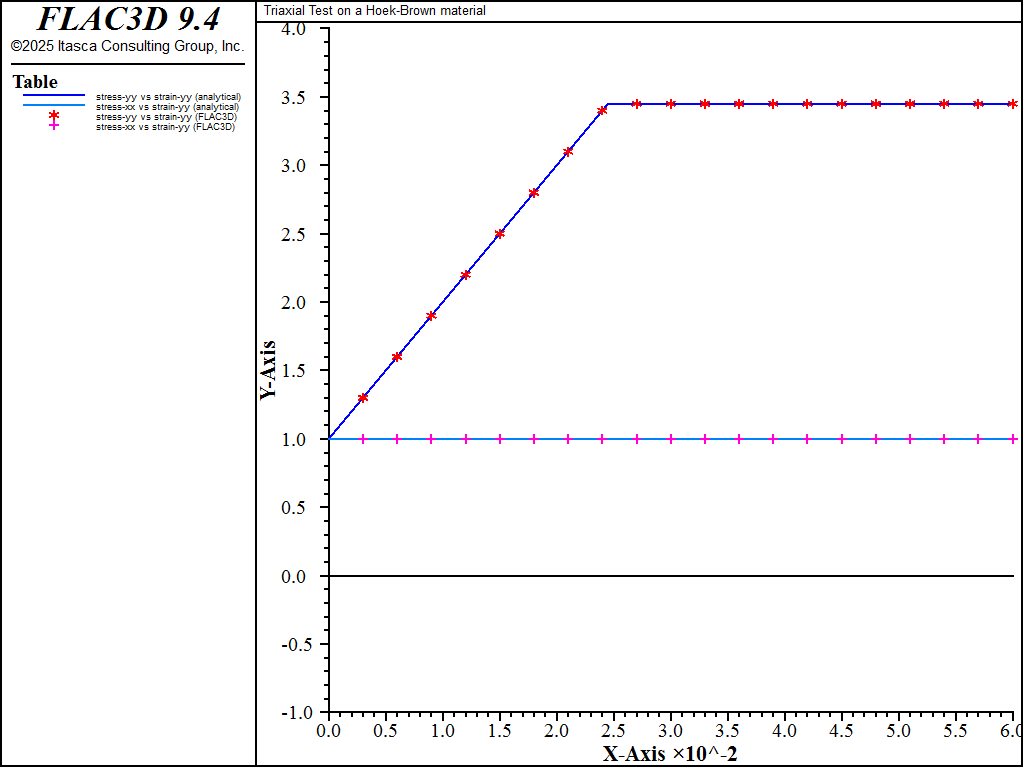 The triaxial tests are performed on a sample of Hoek-Brown material with the following properties: