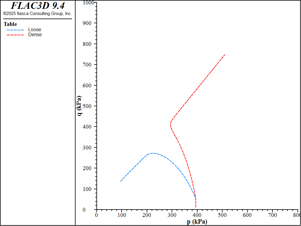 Figure 2: Simulation of \(q\) vs. \(p\) by FLAC3D for undrained triaxial compression tests for initial \(\psi_0=-0.025\) and \(\psi_0=0.10\).