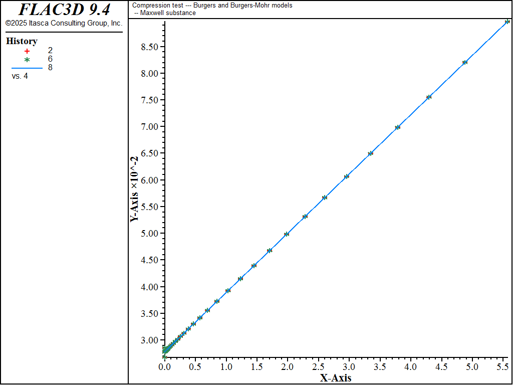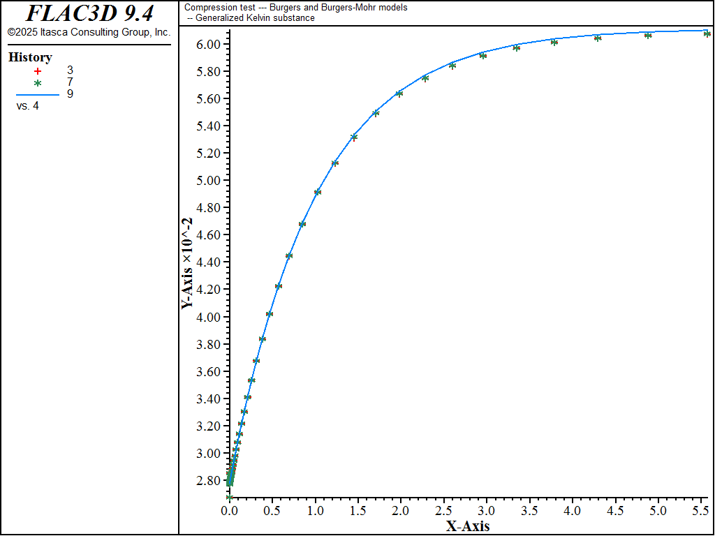The numerical simulation is carried out on six samples, represented individually by one zone. Each substance is modeled using both Burgers model and Burgers-Mohr model. The cohesion property is set to a high value to prevent triggering of the plasticity logic for the Burgers-Mohr model. To model a Maxwell (or generalized Kelvin) substance, the Kelvin (or Maxwell) viscous property in the model is simply ignored. Once the elastic response is obtained (short time response), the velocities are reset to zero before proceeding to the viscous part of the simulation.