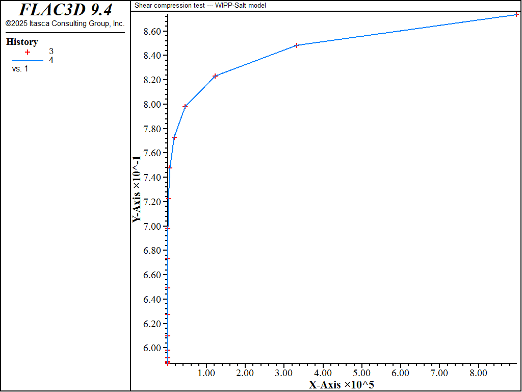 Results of the shear compression test here are presented to validate the WIPP-Salt model in FLAC3D. The test involves one zone at an initially elastic state of equilibrium. The zone is allowed to creep for a period of 23 days, during which time the fractional density is monitored and compared to the analytical calculation.