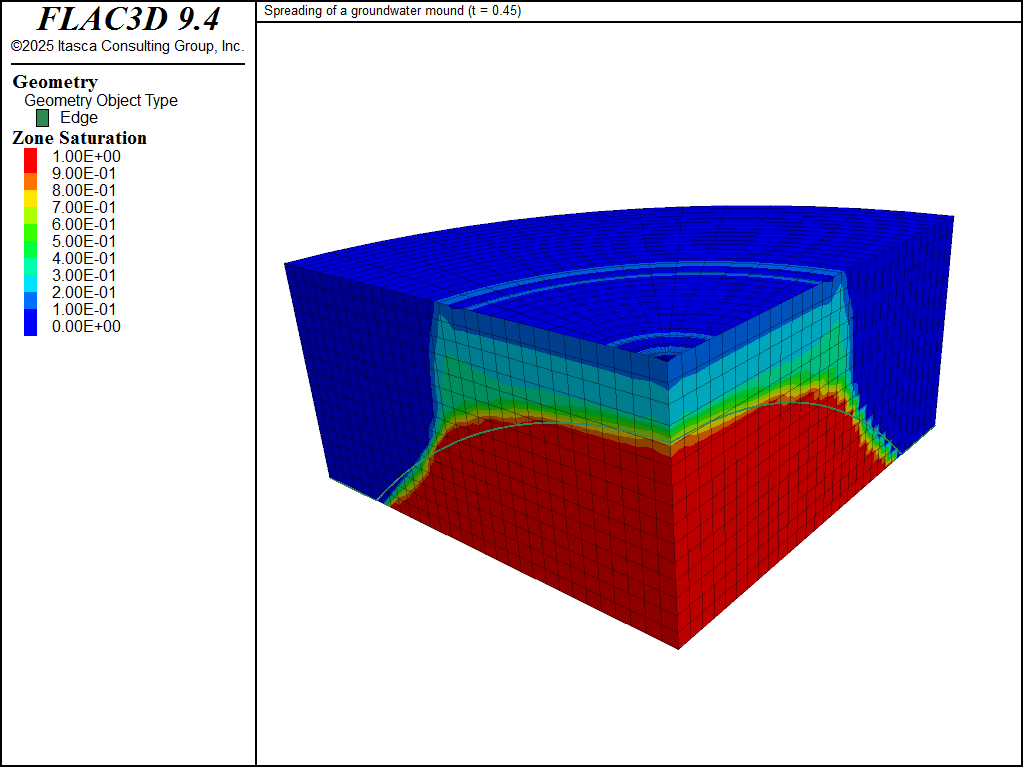 The results are presented in dimensionless form: the scaled geometrical parameters \(r_{0}\) = 1, \(h_{0}\) = 1 are used, and the scaled water properties \(k\) = 0.5 × 10-4, \(\rho _{w}\) = 103, and \(n\) = 0.5 are prescribed in the numerical simulation. To model incompressible flow, the bulk modulus of the fluid, \(K_{f}\), is given a value that is large compared to the pore-pressure variations in the simulation (\(K_{f}\) = 2 × 105); the value \(g\) = 10 is used for gravity. The FLAC3D grid corresponds to a quarter cylinder and contains 2000 zones (see Figure 1). The radius of the model is 2, and its height is 1 unit. The initial saturation is 1 within the mound (radius = 1 unit, height = 1 unit), and zero outside. The initial pore-pressure distribution within the mound is hydrostatic. All boundaries are impermeable by default. As time goes on, the mound spreads out under its own weight. The simulation is conducted for a total dimensionless time value of \(\hat{t}\) = 0.85, with intermediate results at \(\hat{t}\) = 0.35, 0.45 and 0.65.