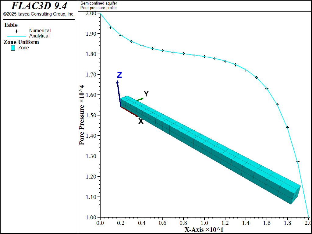 The FISH function checkit compares the amount of leakage calculated by FLAC3D to the solution of (7) at steady-state flow. The difference is printed (in a FISH dialog message) to be 0.03%. The analytical and numerical pore pressure profiles recorded along the base of the model, from \(x\) = 0 to \(x\) = 20, are compared in Figure 2.