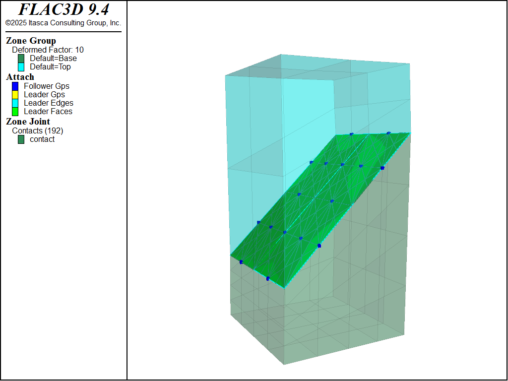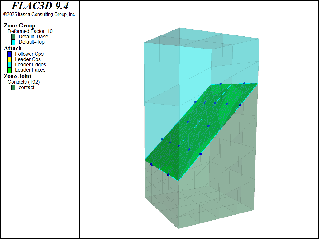 To view this project in FLAC3D, use the menu command . Choose “FLAC/ ZoneJoint/ ZoneJointWithAttach” and select “zonejointwithattach.prj” to load. All data files are found in the project.