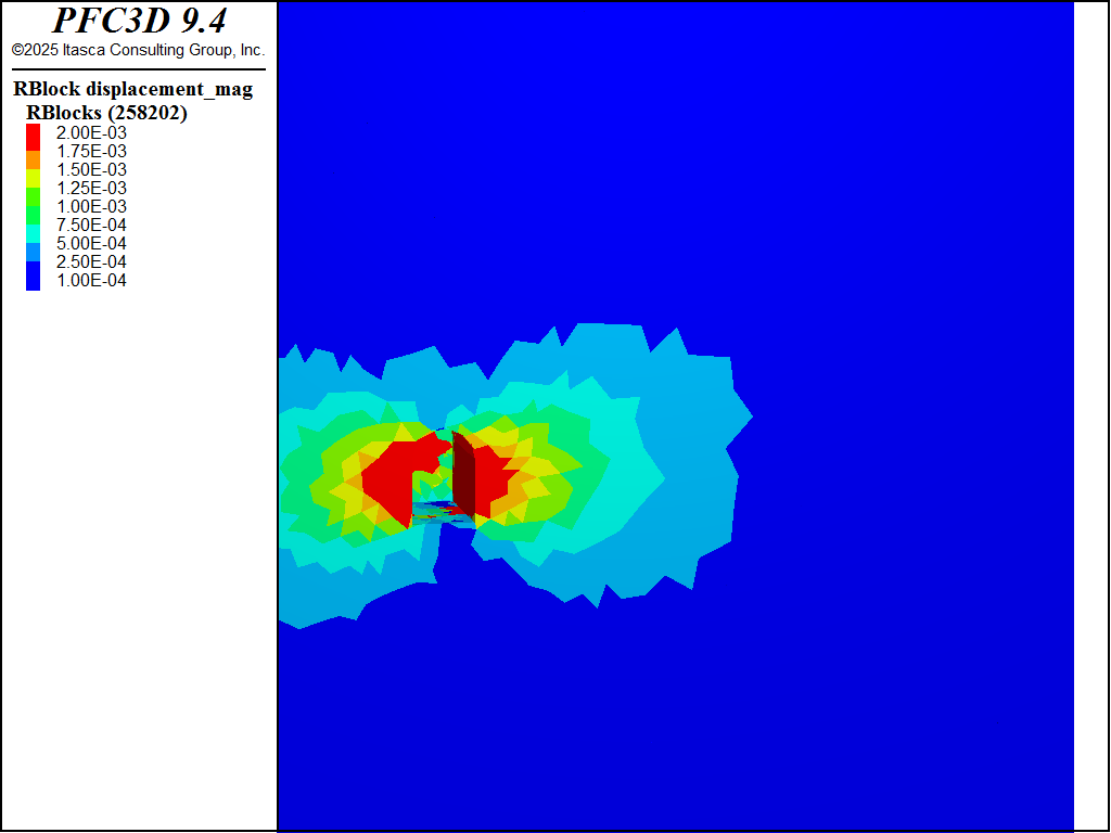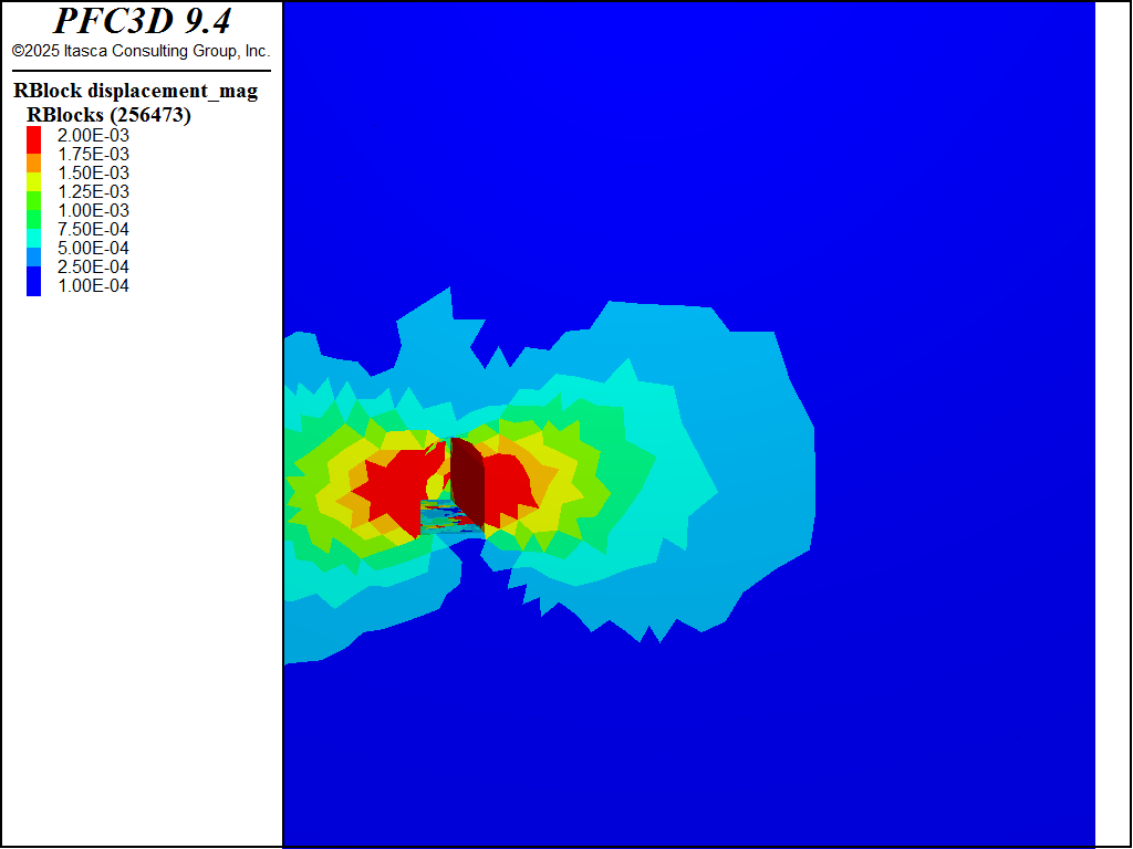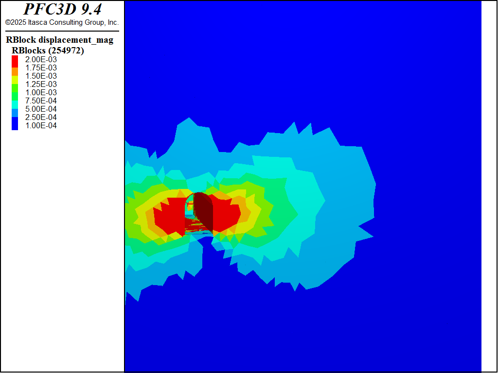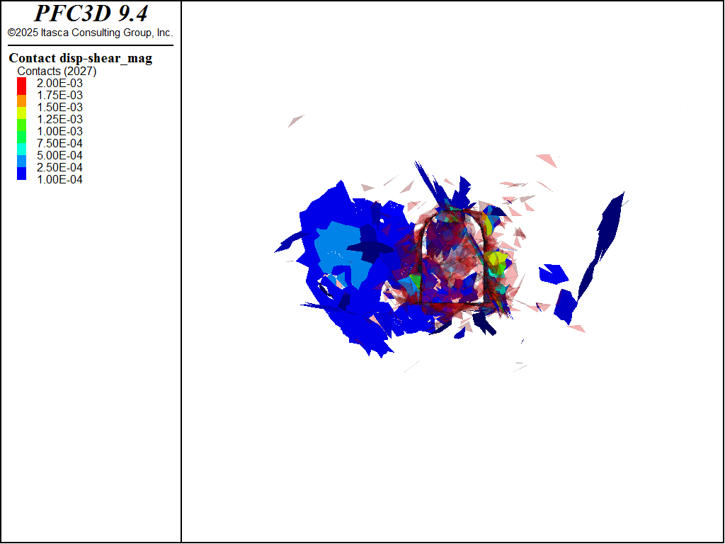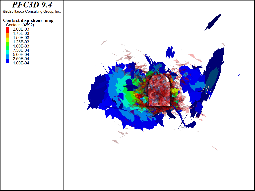 After the preceding steps the environment is enhanced to track cracks in the bulk material and to apply support stresses. The former is accomplished by catching the \(bond_broken\) event for the subpringnetwork model. The \(bond_break\) event triggers when a subcontact is broken, whereas the \(broken\) event triggers when all three subcontacts are broken. Fractures are created for each contact when it is completely broken in different DFNs so that one can visualize the progression of failure. The support stresses are applied with the rblock facet apply command. At each cycle the out-of-balance force and moment are applied to the identified rigid blocks. A simple FISH function is called for each rigid block to compute a multiplicative factor that is applied to the out-of-balance forces/moments. The multiplicative factor is 1 for a fixed number of cycles and then linearly ramps to 0 over a fixed number of cycles for all rigid blocks with the apply condition. In addition, the magnitude of the out-of-balance force on the support blocks divided by the area of the tunnel surface, or the average applied stress, is cataloged.