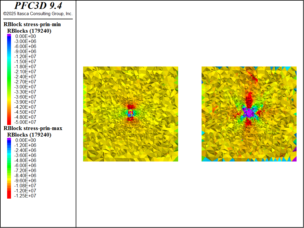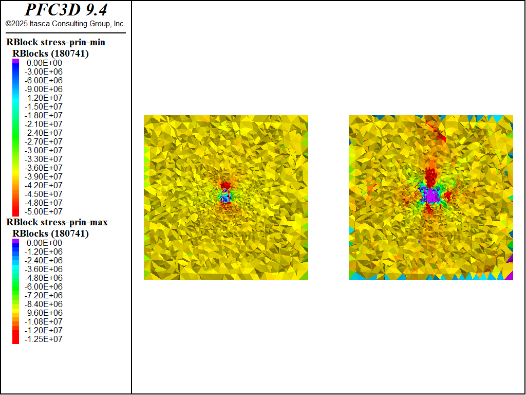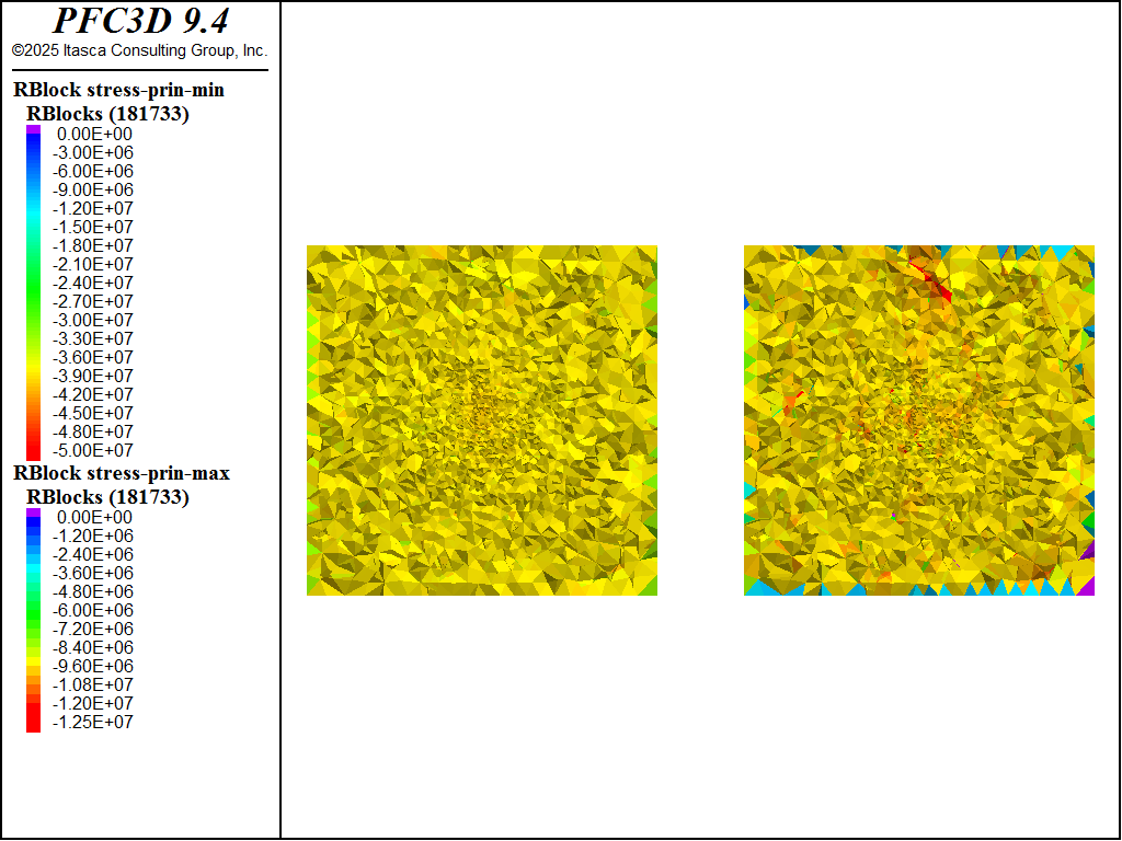 For each of the four excavation stages a unique DFN is created, the tunnel blocks are deleted for that stage, the support blocks are identified for that stage, the \(rblist\) FISH list used to compute the \(appliedStress\) is updated, the tunnel surface area is updated, the old apply conditions are removed (if any), the new apply conditions are installed and the model is solved. Subsequent to solving for each stage fragments are computed and assigned to unique group slots, allowing one to visualize the progression of the fragmentation as well.